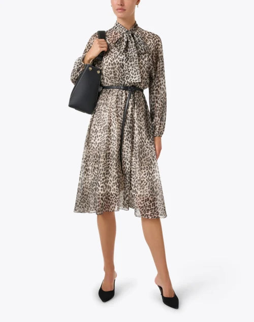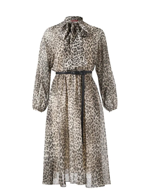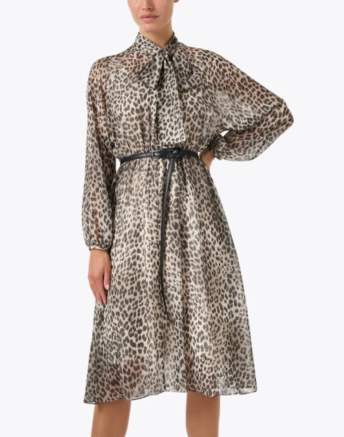 In this season's favorite neutral, Max Mara Studio's leopard print Glizia dress is the perfect addition to any wardrobe. Brimming with feminine flair, this midi silhouette features an elegant self-tie neckline, long balloon sleeves, and a belt at the waist for a flattering finish. Pair it with a black shoulder bag and kitten heels to let this eye-catching piece shine.