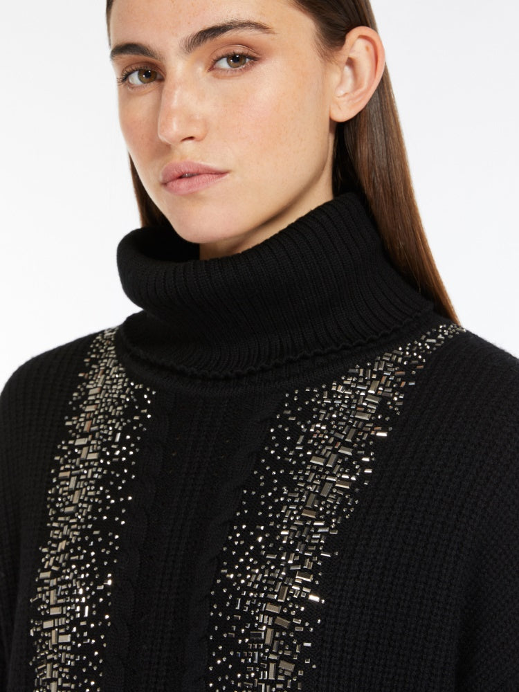 Luxurious, pure wool yarn pullover in a fisherman’s rib knit, with a high neck and long low-set sleeves. Oversized-volume style, embellished with applied, gradient-effect mirrored glass embroidery and central cable-knit details on the front.
