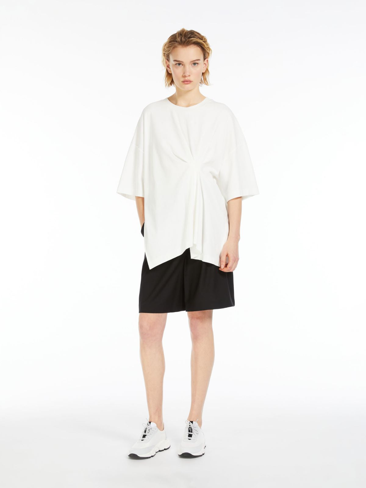 Short sleeved T- shirt in soft cotton interlock fabric. The oversized model boasts delicate asymmetrical pleating on the side, side slits and elbow length drop shoulder sleeves.