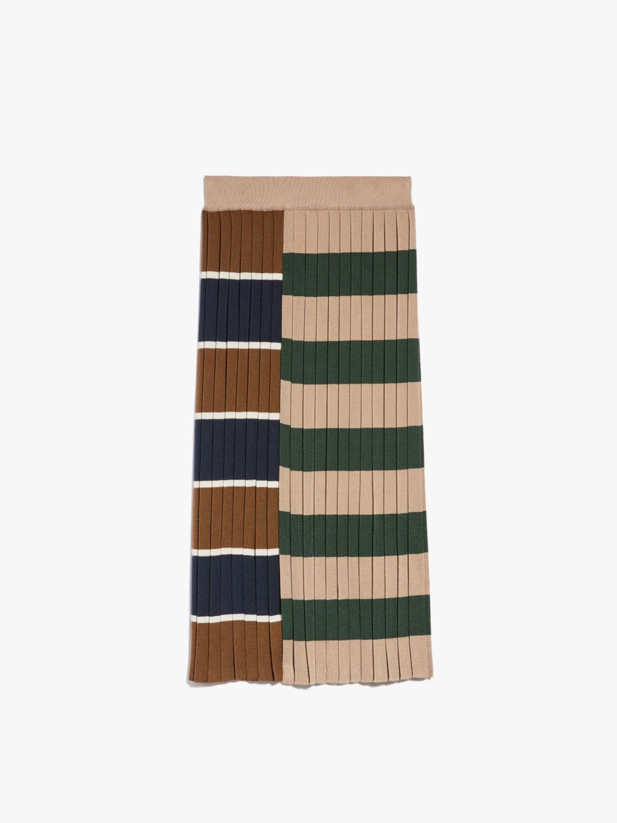 Wool blend yarn skirt featuring waistband detail. Movement bestowing full length pleated and patchwork detail. Length: 85 cm.