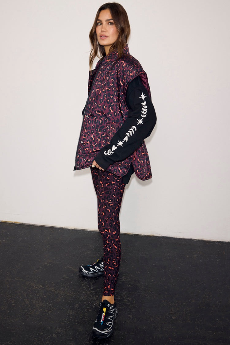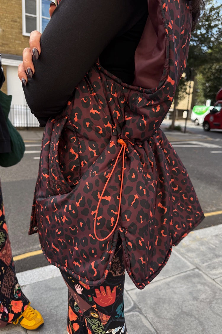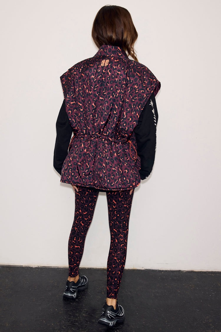 A slightly oversized, water resistant gilet, perfect for layering over gymwear or everyday outfits. Printed with our new, slightly darker edition of our iconic leopard print. With a concealed zip and drawstring waist, to add some structure to the simple silhouette, and in a lightweight, water resistant padded base with a funnel neck to keep you protected from the elements.