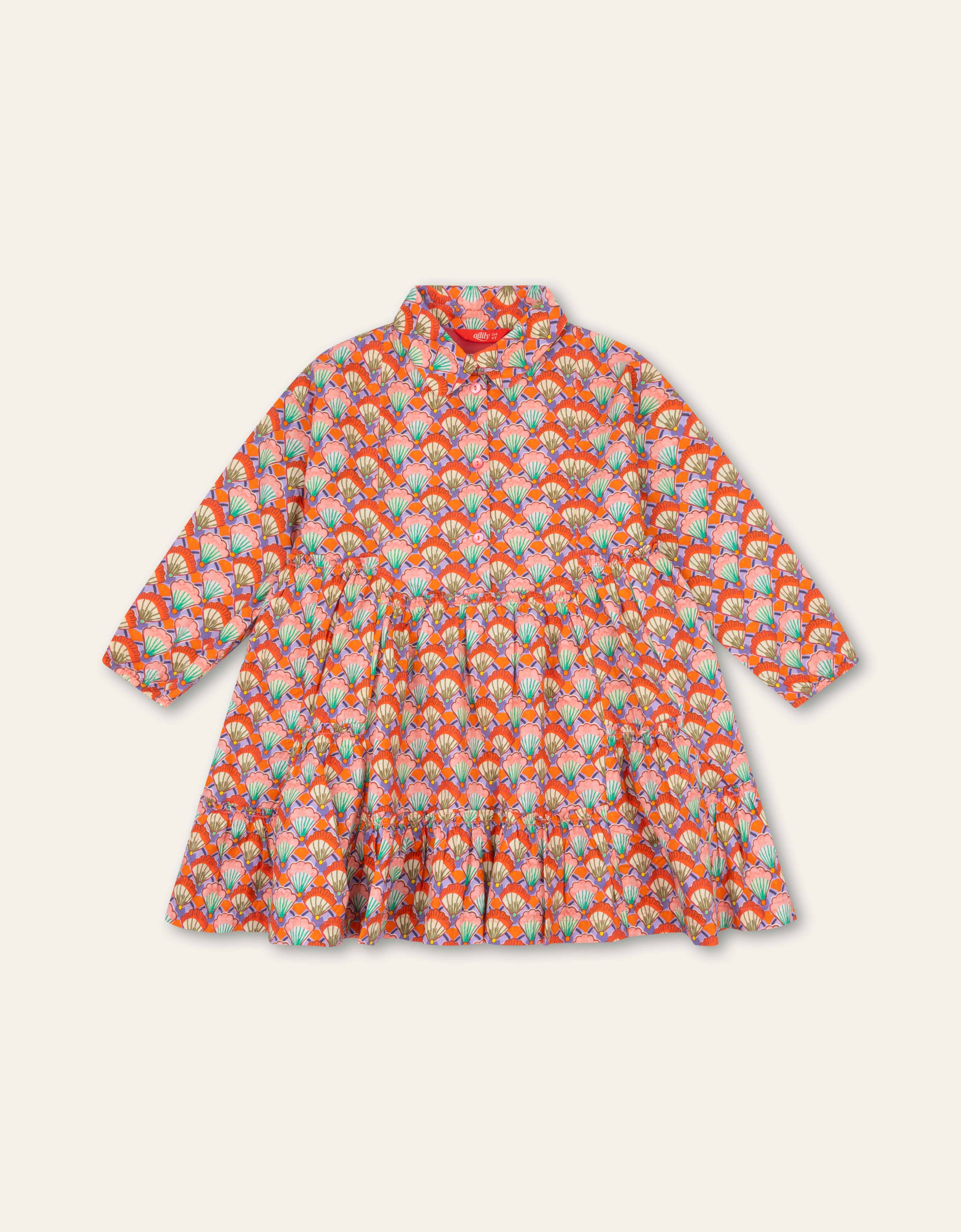 A-line dress with our elegant Avalon print of hand drawn fans in which the colours flow into each other. With sweet collar, shining buttons and small fringe. - Loose fit - Made in India - 100% Cotton