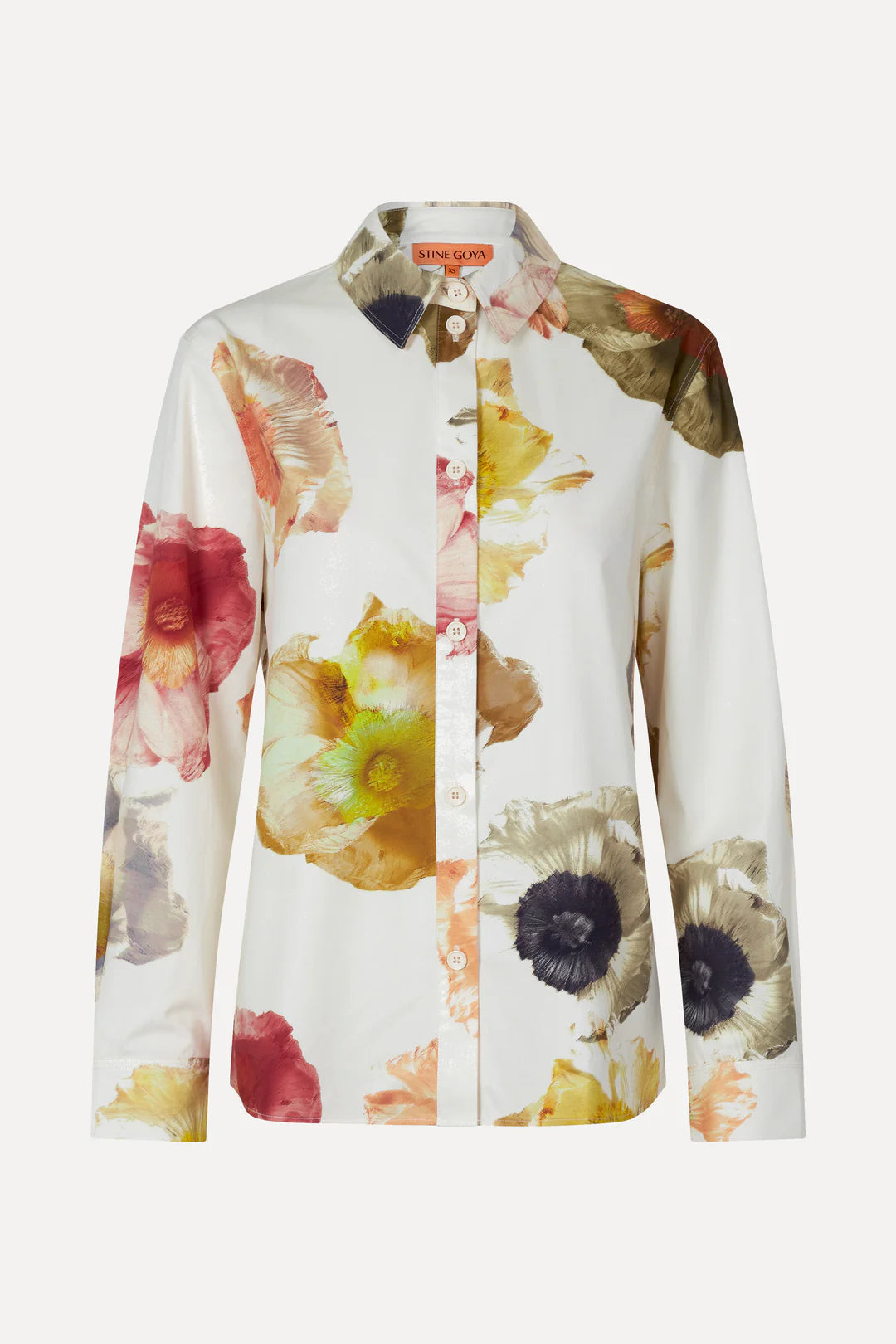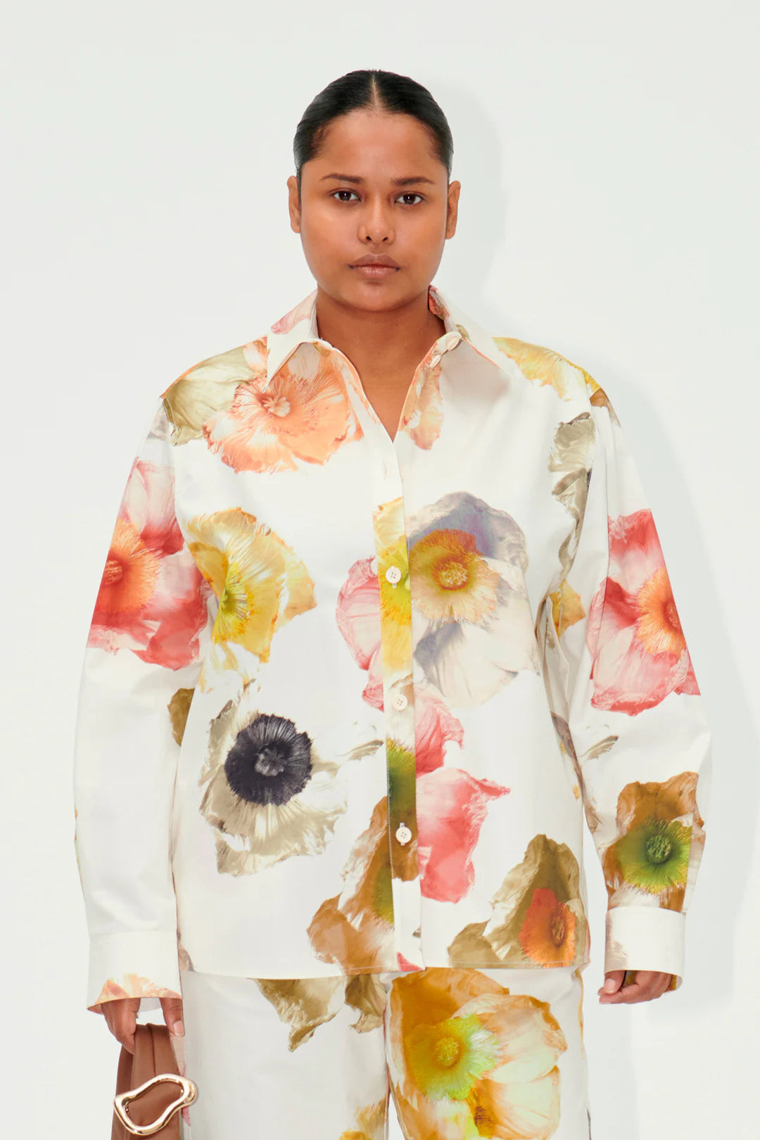 BOXY BUTTON UP BLOUSE WITH LONG CUFFED SLEEVES, PASTEL FLORAL PATTERN AND BACK SLIT WITH BUTTON UP DETAIL. PAIR WITH THE SGCAROLA PANTS IN PASTEL POPPIES.